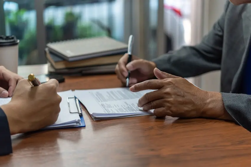 Alpharetta construction workers' compensation lawyer reviewing a North Fulton County job site injury claim with an injured worker during a free case evaluation in Georgia